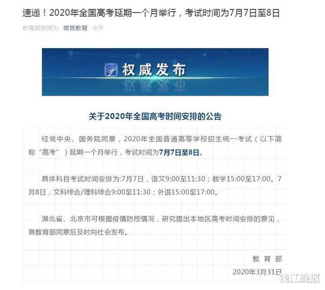 经党中央、国务院同意,2020年全国普通高等学校招生统一考试(以下简称“高考”)延期一个月举行,考试时间为7月7日至8日。