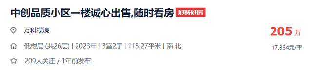 近日,万科揽境成交了2025年首套二手房,建面约118㎡中楼层,总价约226万,单价仅约19092元/㎡,中创区又一个“跌破2万”的豪宅出现了。