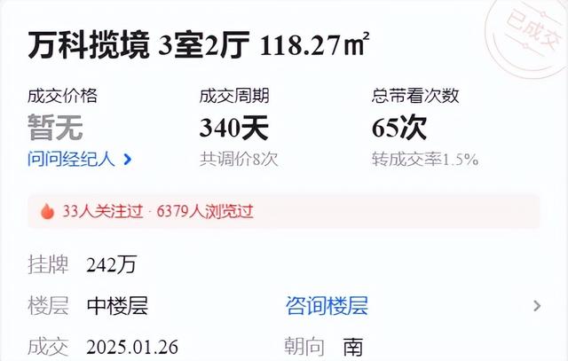 万科揽境这套二手房挂牌价为242万,成交周期长达340天,业主先后调价8次才得以出手。如果与万科揽境2.95万/㎡的首开均价相比,这套二手房单价下跌超1万/㎡,跌幅约35%,总价缩水或超120万。