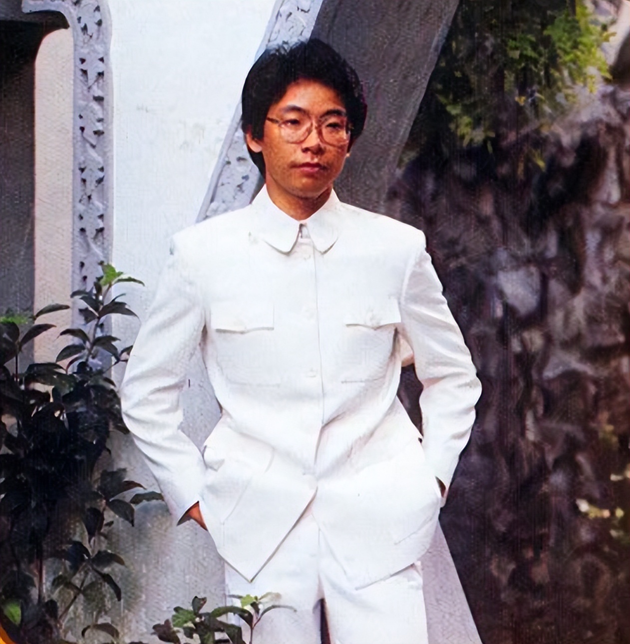 1984年2月1日晚,张明敏身着卡其色西服套装,系着棕色条纹领带,戴着复古金丝边眼镜。