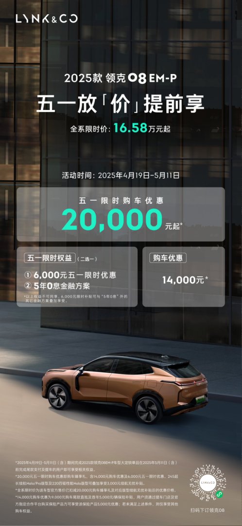 为了回馈广大消费者的支持,领克汽车在车展期间推出了五一限时购车福利活动。自4月19日起至5月11日,领克08EM-P限时价仅16.58万起,同时购车还可享受2年0息的超值金融政策,让你轻松拥有这款高品质的智能座驾!
