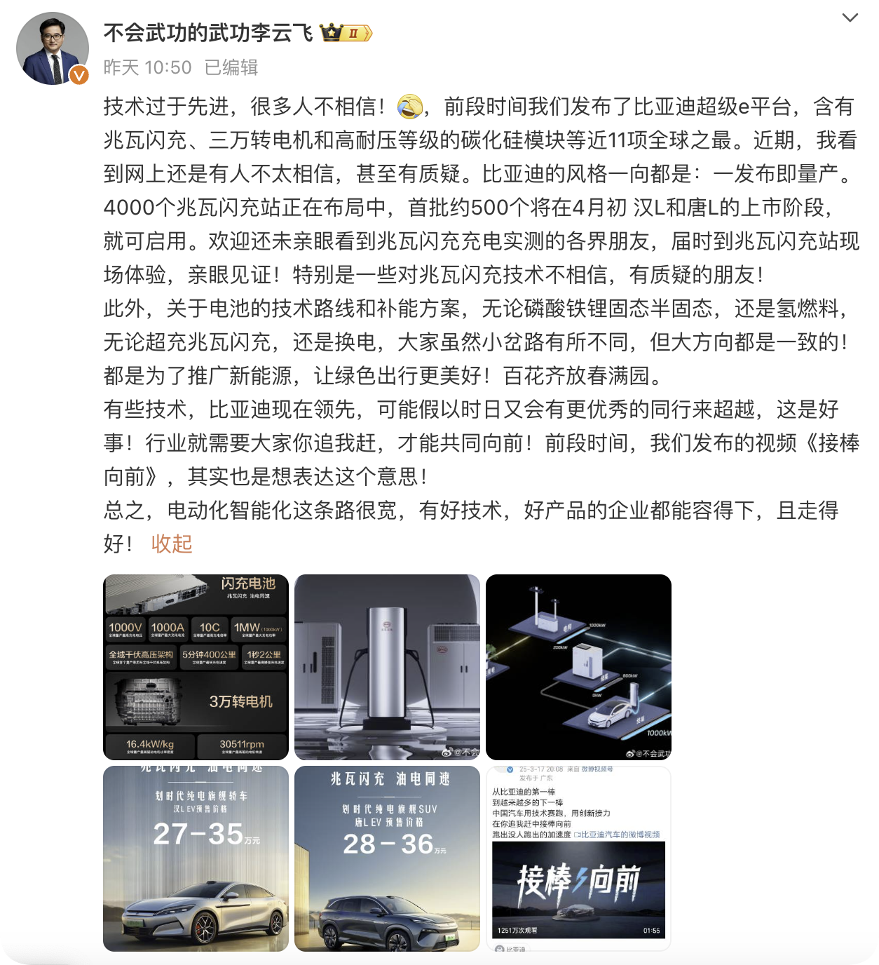 1秒2公里?怎么可能?5分钟充电400公里?又是PPT造车?当比亚迪发布超级e平台技术的时候,这些质疑声一直都没有断过,说实话,面对比亚迪超级e平台的兆瓦闪充、三万转电机等新能源行业之最的技术时,是谁谁不迷糊,所以比亚迪高管无奈说出:技术过于先进,很多人不相信!而比亚迪回应质疑的方法也很简单:发布即量产,4000个兆瓦闪充站正在布局中,4月初,全国500座兆瓦闪充站将随汉L/唐L同步启用,邀请所有质疑者现场踢馆!比亚迪真的是有技术实力又有品牌格局啊!突然发现,关于比亚迪这波回应,最令人震撼的不是技术本身,而是比亚迪踢馆式的自信,回看历史,2014年比亚迪发布542战略时,多少人嘲笑比亚迪新能源弯道超车是天方夜谭?2020年刀片电池针刺实验引发群嘲,如今却成为欧盟强制标准。那些曾被质疑"过于先进"的技术,最终都变成了行业标配。从油电同价到电比油低再到如今的充电比加油还快,比亚迪一直在引领新能源技术的发展,超级e平台的发布更是如此!以三大核心技术突破与全生态布局,推动整个行业的技术进步,树立纯电时代技术新标杆!比如超级e平台首发全域千伏高压架构,将整车电压平台全面推升至1000V级别。超级e平台搭载的闪充电池,峰值功率下可实现"1秒2公里"的充电速率,汉L实测数据5分钟补里程400公里,真正做到了充电时间和加油时间一样短。这些技术将在4月份上市的汉L、唐L上首次搭载,比亚迪高管邀请大家实地见证超级e平台那些强到令人难以相信的技术,有兴趣的朋友可以参与一波。
