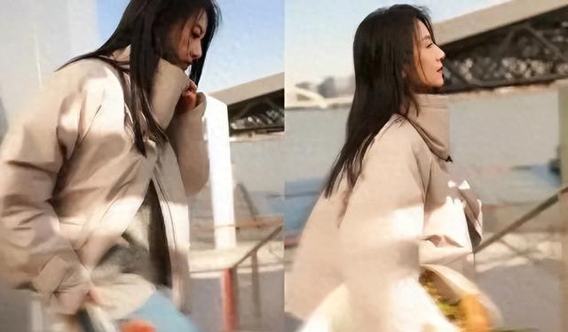 高圆圆穿着一身保暖又时尚的衣服,头上戴着帽子,整个人显得很随意自在。