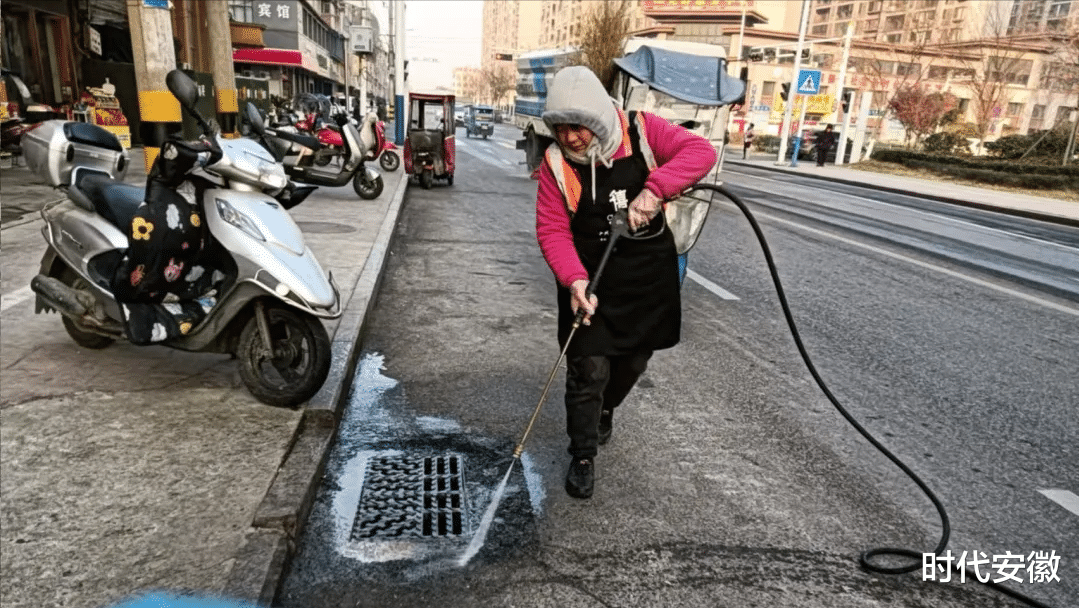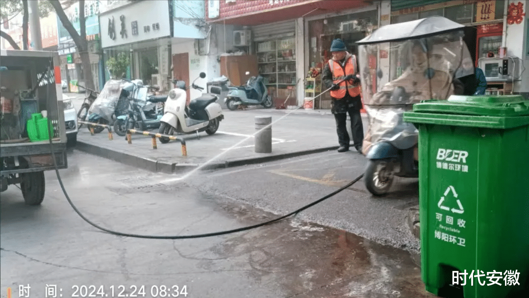 在作业中,环卫工人采用“扫+浸+刷+冲”的综合清理模式,力求彻底清除污渍。他们先用扫帚清扫残留垃圾,再撒上烧碱等清洁剂浸泡污垢,随后进行地毯式刷洗,最后用高压水枪冲洗。完成后,工人还会用扫帚将路面积水扫入下水道,确保路面无积水。