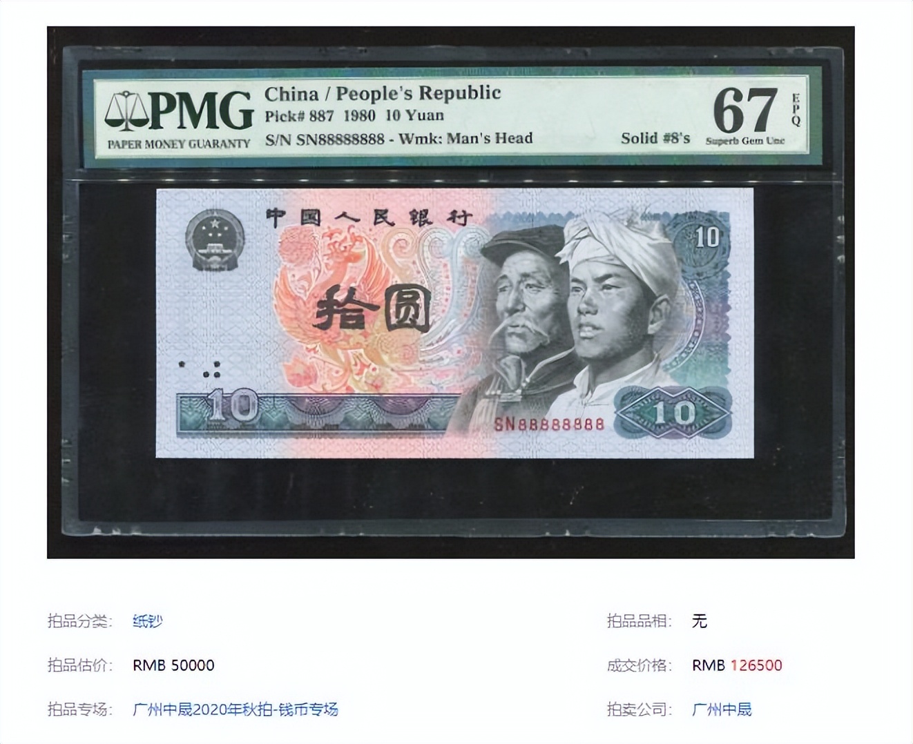 在广州中晟拍卖会中,有一张1980年的10元纸币,竞然是拍出了12.65万,这也是近几年表现最好的四版10元,我们除了惊叹之外也要知道,四版10元已经拥有了不错的市场溢价,其中拥有珍贵特征的,单张几千、几万都是轻轻松松。