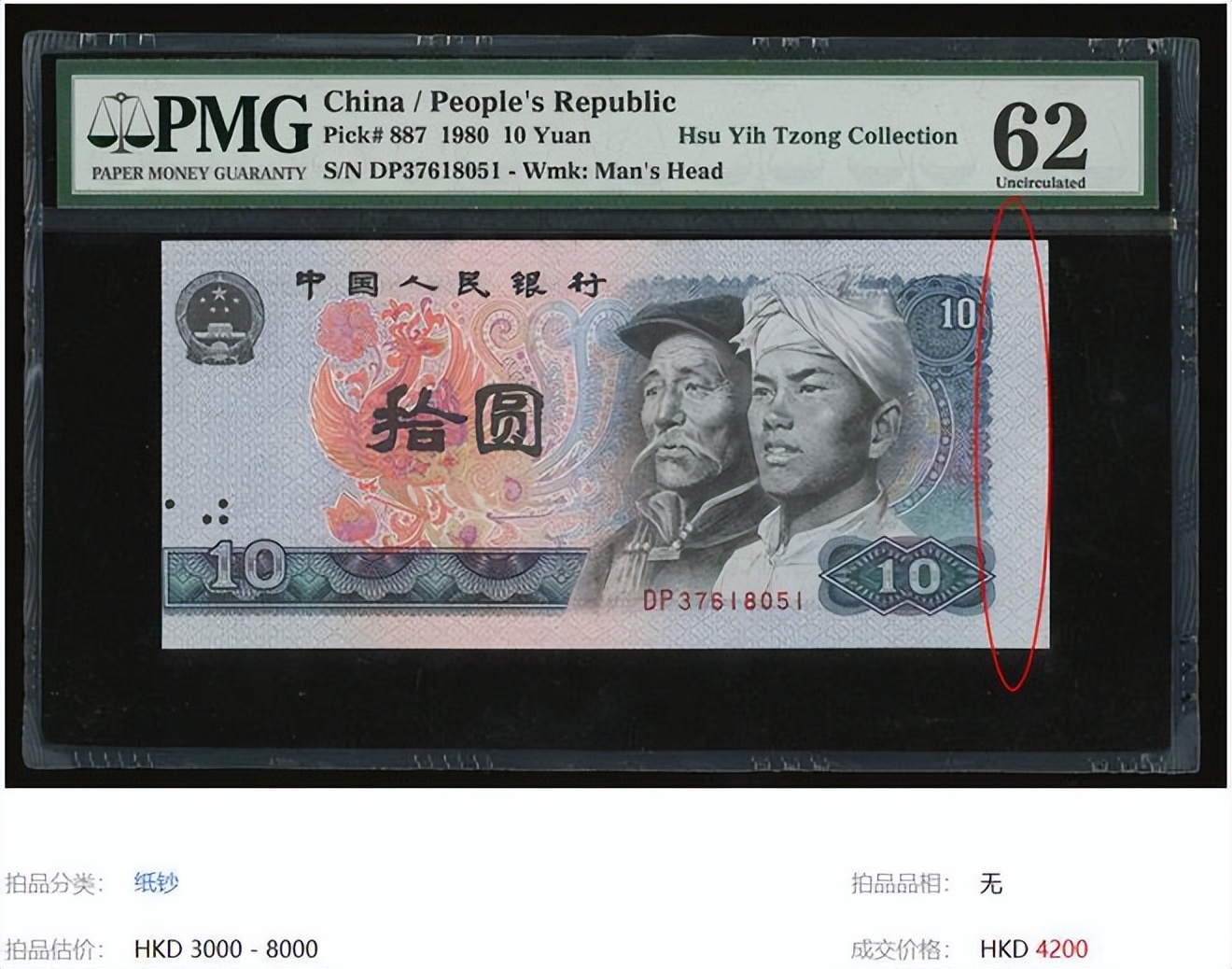 第二我们需要注意纸币是否拥有奇怪的特征,是否和正常的纸币不太一样,比如图片中这张拍了4200的80年10元,它的币面图案就整体向左移动了,这是比较珍稀的移印币,遇到就别错过。