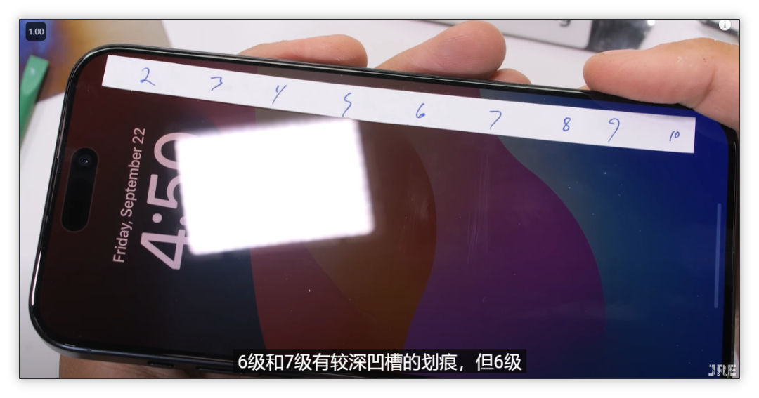 油管博主JerryRigEverything 对15promax做了一系列测试,首先屏幕玻璃在莫氏硬度6级时开始出现划痕,但不明显,7级时就很明显。