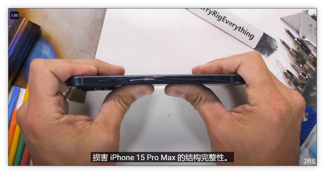随后,他用小刀开始刮15promax的边框,非常轻松地就留下了划痕。他甚至调侃到,苹果宣称花了14个小时才完成15边框得喷漆,然而他只要14秒就破坏了。