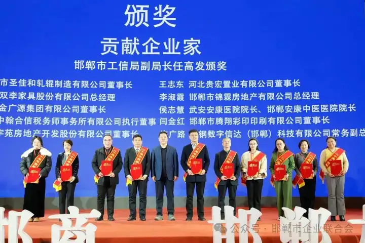 市工信局副局长任高发为荣获二十年贡献企业家颁奖。获奖者:刘宇涵 邯郸市圣佳和轧辊制造有限公司董事长李志军 河北双李家具股份有限公司总经理郭刚锋 河北金广源集团有限公司董事长武俊霞 河北中翰合信税务师事务所有限公司执行董事于尽良 河北宇苑房地产开发股份有限公司董事长王志东 河北贵宏置业有限公司董事长李淑霞 邯郸市锦霖房地产有限公司总经理侯志慧 武安安康医院院长、邯郸安康中医医院院长闫金红 邯郸市腾翔印刷有限公司董事长许广路 河钢数字信达(邯郸)科技有限公司常务副总经理