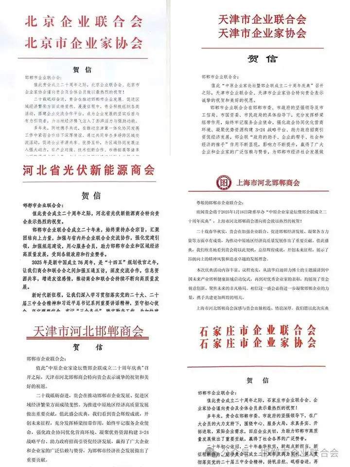 2025年1月16日下午,“中原企业家论坛暨邯郸市企业联合会二十周年庆典”在邯郸招商大酒店隆重举行。活动由邯郸市企业联合会主办,中原经济协作区企联(企协)联盟协办,邯郸市中道房地产开发有限公司承办,邯郸市工信局、邯郸市民政局、邯郸市国资委、邯郸市投资促进局、邯郸新闻传媒中心、中原经济协作区联络处作为指导单位,河北硅谷化工有限公司、邯郸市邯三建筑工程有限公司、邯郸制药股份有限公司、河北邯郸丛台酒业股份有限公司、邯郸市华森医药连锁股份有限公司、邯郸市龙腾房地产开发有限公司、邯郸天桥股权投资基金为支持单位。指导单位领导、京津冀三地企业联合会、企业家协会领导,河北省内市级企业联合会、企业家协会代表,中原经济协作区4省13市企业联合会、企业家协会代表,异地邯郸商会、邯郸异地商会及其他友好协会代表,邯郸市企业联合会领导及会员企业代表(含团体会员)及媒体代表等共约300人参加活动。