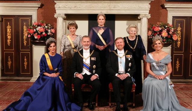精致的妆容,一头大卷发,更是给这位气场强大的女强人王后增添了妩媚。莱后这次也是难得没有佩戴王冠出席国宴啊,不过却也难掩王后的优雅和贵气,20几年的王室金尊玉贵的生活,果然没白费。