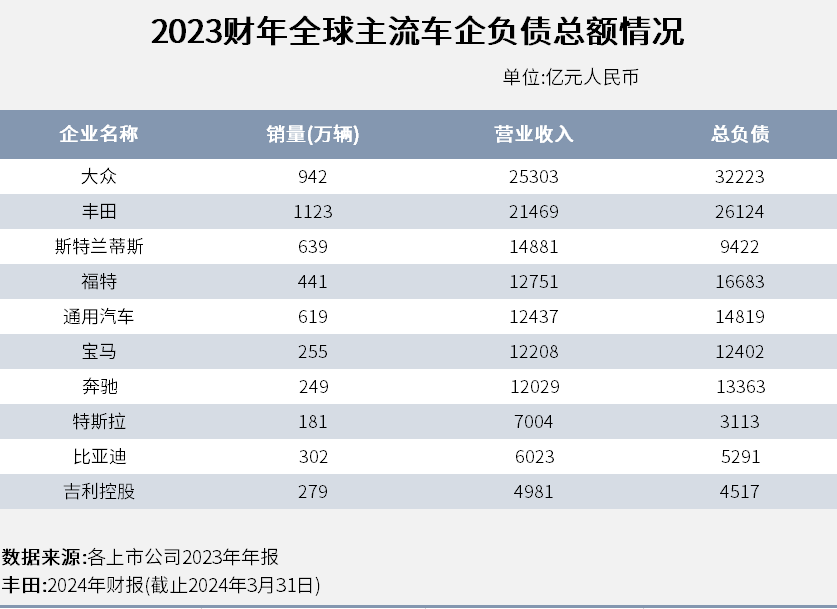 众所周知,汽车行业需要常年投入大量资金研发与创新技术,每次新车型的推出背后都是巨大的资金投入,还有全球范围扩建工厂、供应链管理等,总之,汽车作为重资产行业,负债是常态。据2023财年全球主流车企负债总额情况来看,国内外主流车企的总负债普遍较高,大众营收2.5万亿元,总负债达3.2万亿元;丰田营收2.1万亿元,总负债也有2.6万亿元,这两家总负债均高于营收。