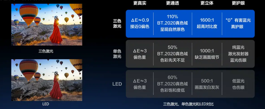 更佳的色彩还原度:激光的光线纯净度更高,色域覆盖率是LED的两倍以上,使得色彩还原更为真实细腻。