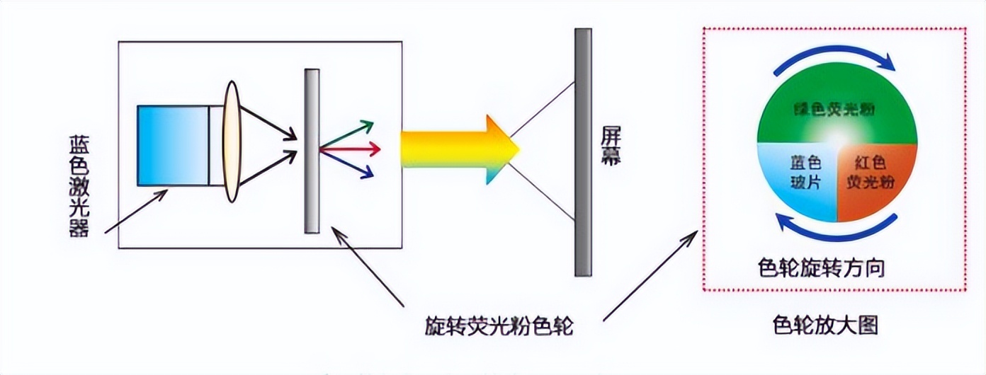 单色激光技术通过发射单一蓝色激光,激发荧光色轮产生红、绿两色光,再进行合光过程,形成多彩画面。由于所产生的红、绿色光并非激光器直接发出,所形成的光线带有较多的杂光,为了提高色纯度一般会加入滤光片来过滤杂色光,但同时也会因为滤光而降低光线的整体亮度。