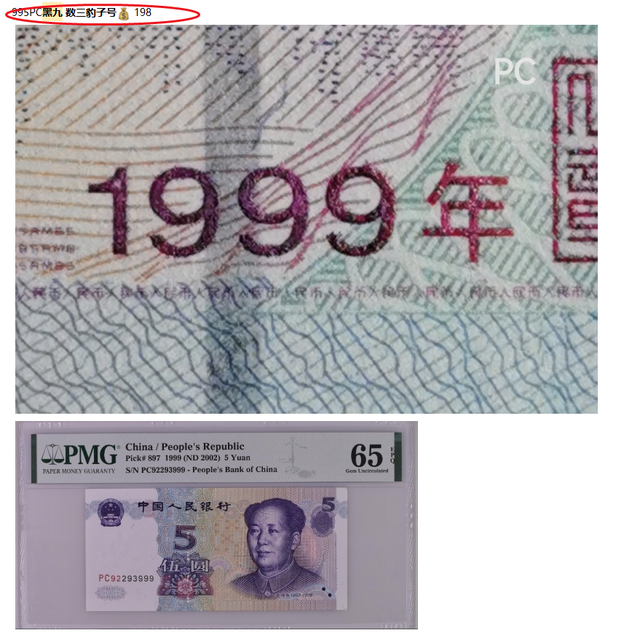“黑9”:纸币正面年份“1999”中的“9”颜色更深,明显偏黑,因极其少见,被称为特殊印刷错误,市场价高达198元/张;