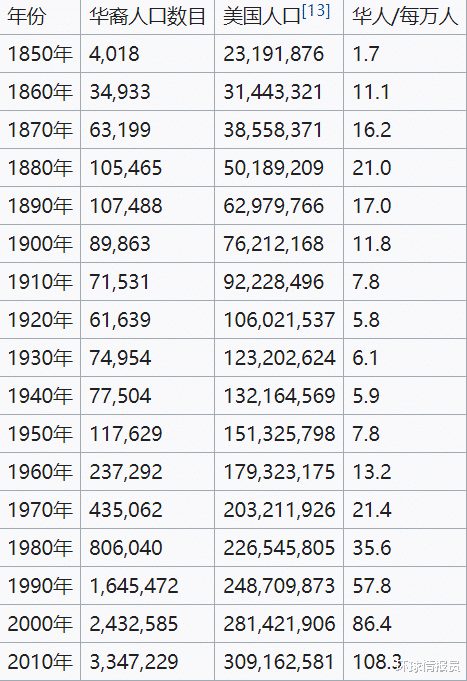 ▲美国历年的华人人口数量和全国总人口数量