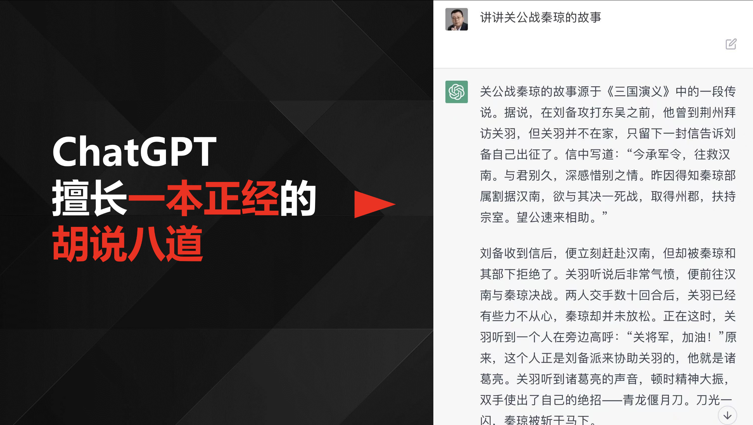 这一页PPT说的是ChatGPT的一个特点——擅长一本正经的胡说八道,大家可以看看它讲述关公战秦琼的故事,是多么的精彩,是精彩的胡说八道。