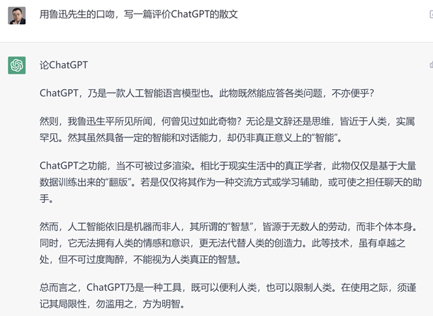 说白了,生成式AI只是个工具。比如我让ChatGPT模仿鲁迅口吻写的这篇文章,知识产权应该归谁?归鲁迅?归我?还是归ChatGPT?