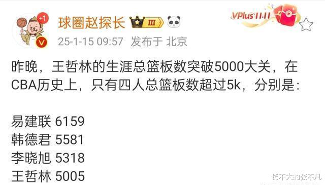无论如何,比赛结果都已然确定,不会再有改变。可不少球迷却没留意到,在本场比赛里,王哲林达成了一项了不起的历史记录呢。他所拿下的篮板球数量成功突破了5000这一大关,就此在CBA联赛历史上位列第4名啦。
