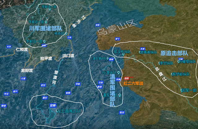 老蒋马上判断出,红二六军团这是要学一年前的中央红军,渡过普渡河,然后从龙街渡或皎平渡过金沙江,再一路向北经过会理,德昌,西昌,大渡河,去和四方面军会师。