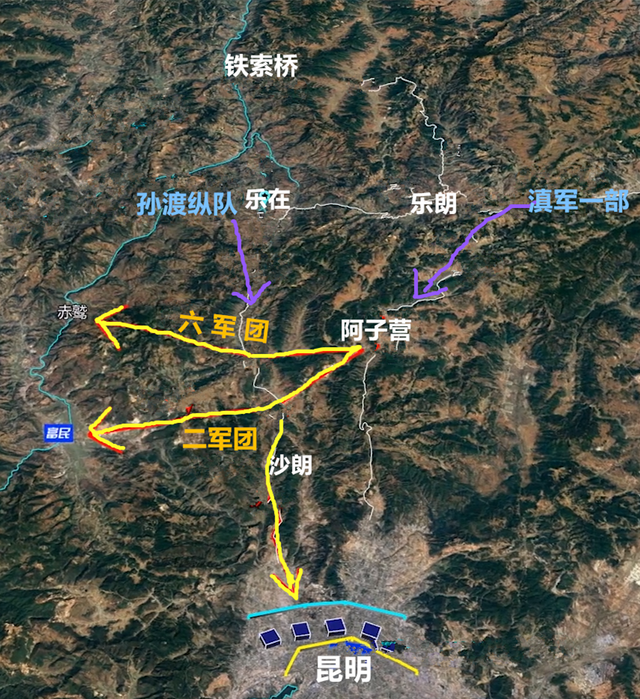 原来,是南面负责进攻乐在的六军团遇到了龙云的直属部队主力,而且还有紧跟而来的孙渡纵队,导致六军团进展不顺。如下图