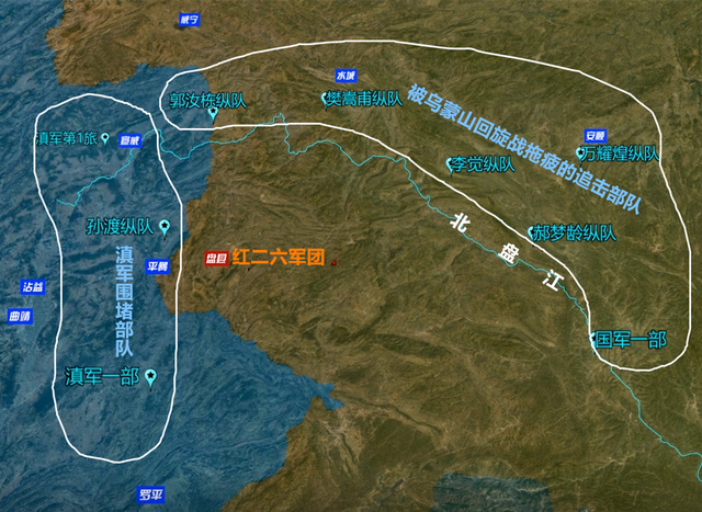 除了近在眼前的滇军围堵部队,西面还有在昆明、普渡河一线的龙云直属部队,北面的金沙江北岸还有川军杨森部和李家钰部构筑的金沙江防线。如下图
