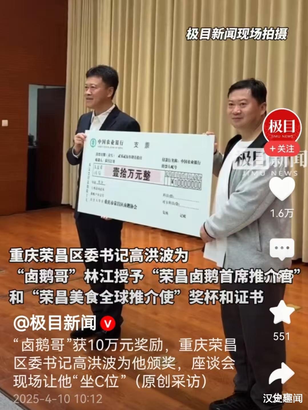 尤其是带火荣昌美食的“卤鹅哥”,备受网友的关注和喜欢。开会时高书记,还让他坐在C位,给他颁发证书,让他担任荣昌当地美食的代言人,推荐管。