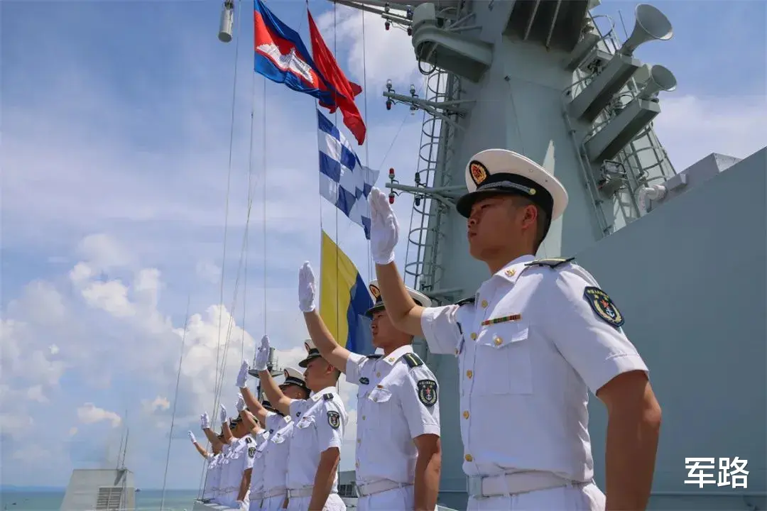 5月19日,海军83舰编队访问柬埔寨时换成了大(卷)檐帽。