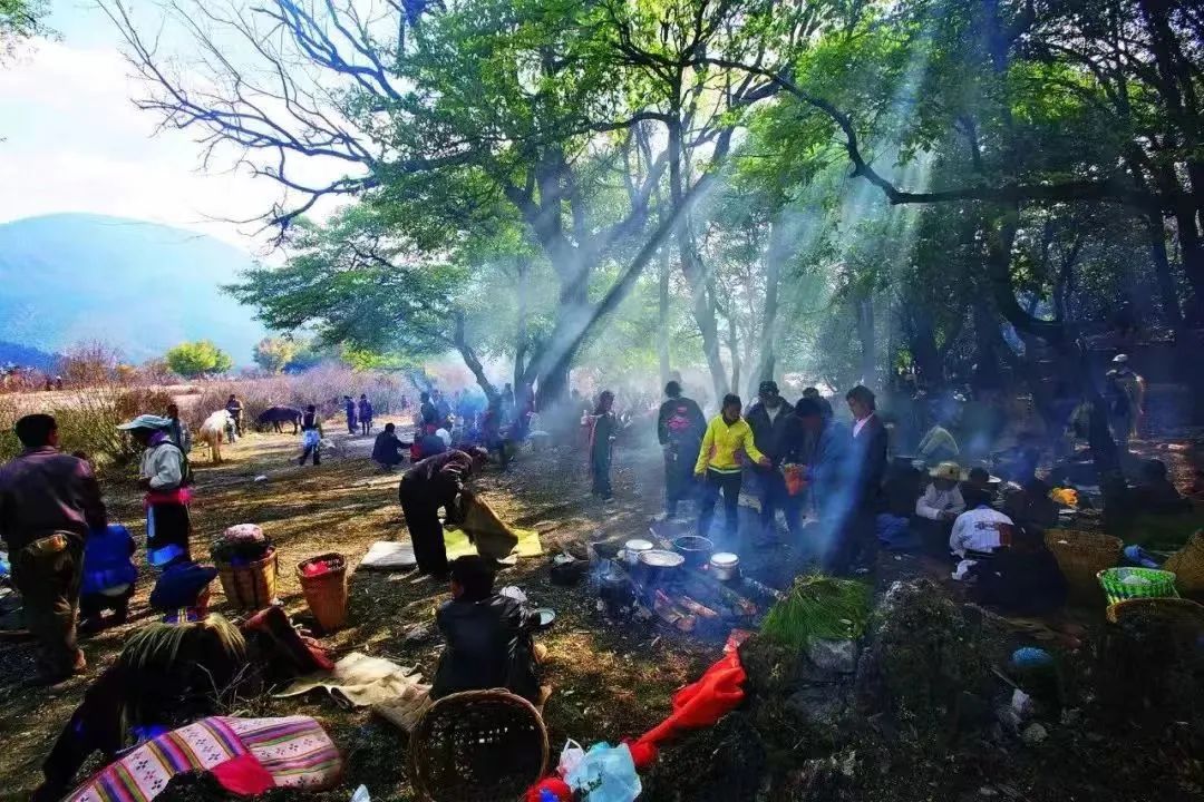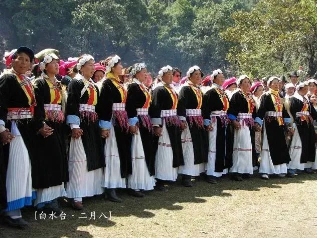 到了二月初八这天,人们身着盛装来到白水台烧香祈福,祭拜神明。燃起篝火,在地上垫上松针叶,摆上饵块、粑粑、葵花籽、梨、鸡鸭鱼肉等食品和热茶。大家席地围坐,亲友们互相问候、开怀畅饮。饭后,人们会围成一圈,在悠扬的芦笙声和欢快的锣鼓声中翩翩起舞。青年男女会在浓荫覆盖的大树丛中,对唱山歌......场面盛大又热闹。