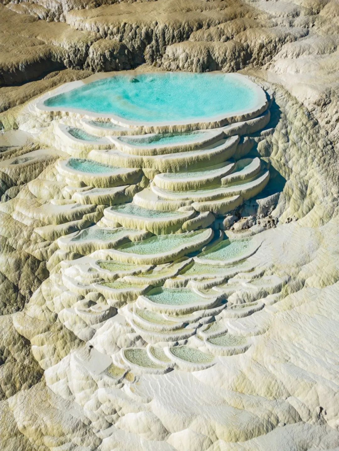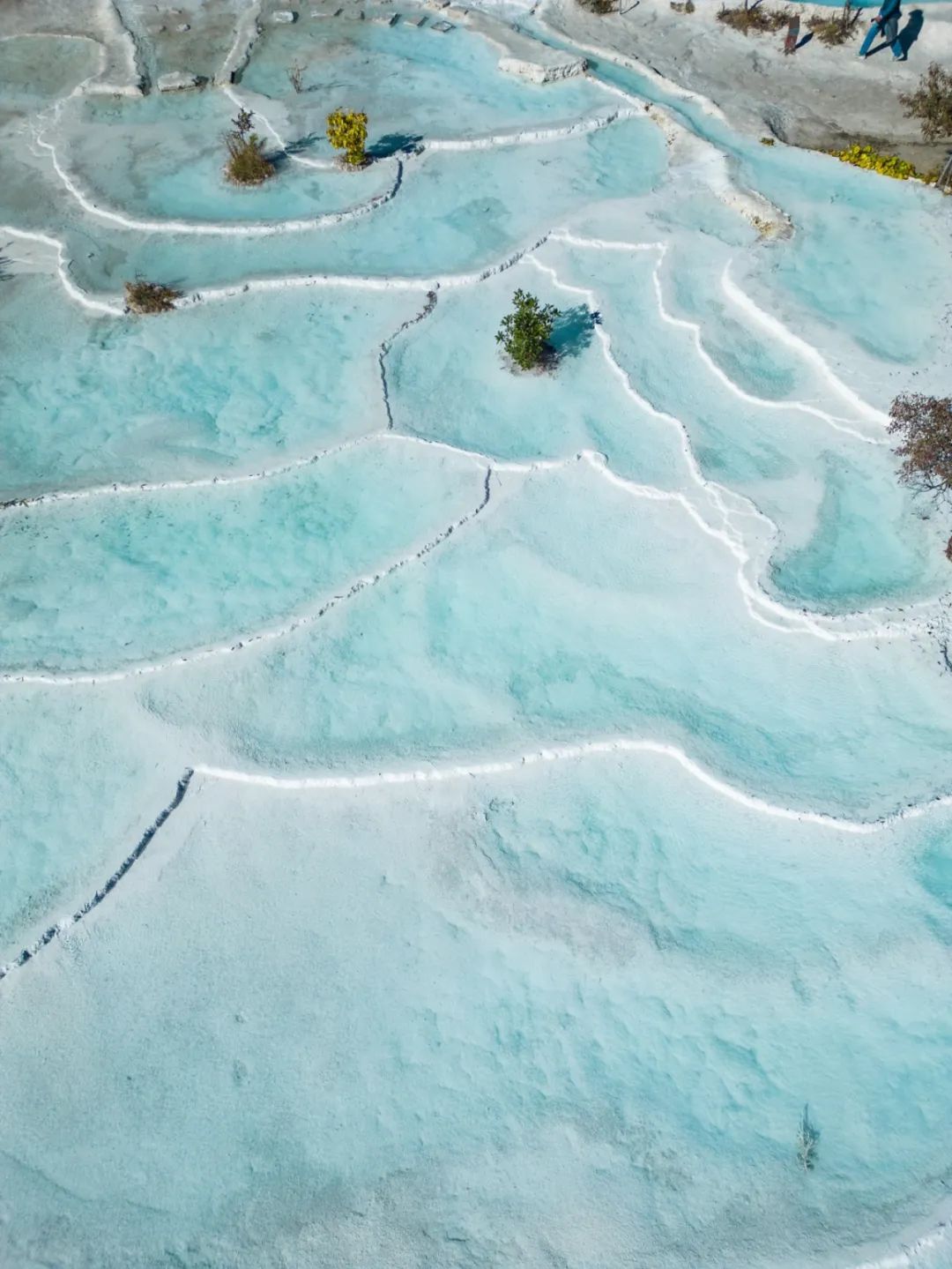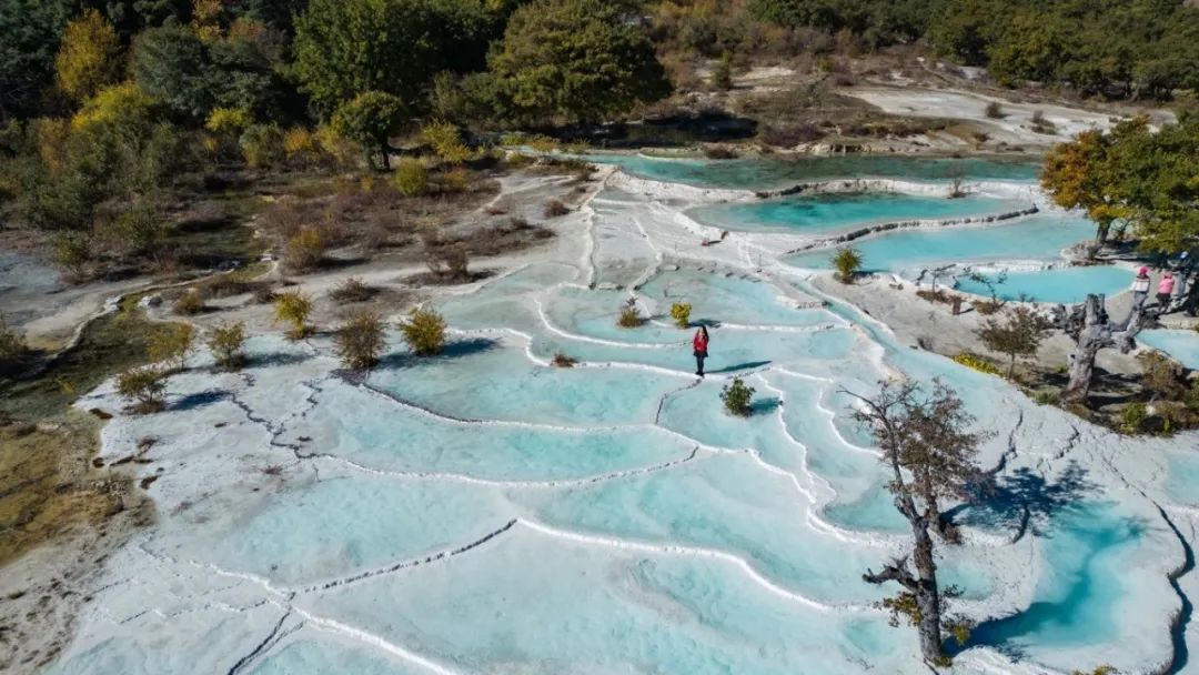 白水台位于哈巴雪山之麓,面积约3平方公里,是我国规模最大的泉华台地。因为水中富含碳酸氢钙,经长年累月的流淌和阳光照射,形成乳白色碳酸钙沉积物台幔,犹如层层梯田。
