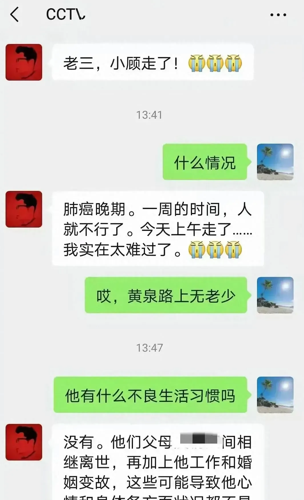 一周内病情急剧恶化,最终离开了人世。朋友特别提到,顾国宁并没有不良的生活习惯,家庭变故才是导致他心情低落的主要原因。