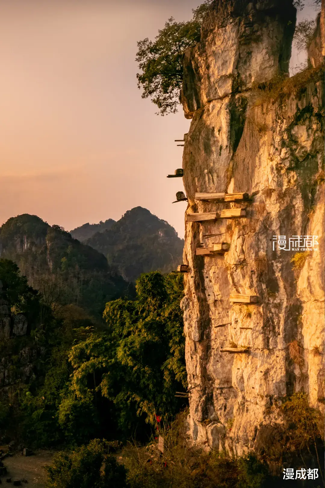 夕阳中的悬崖峭壁自带金光,为这份历史痕迹凭添更多浓墨重彩的神韵,也多了一份让后人敬仰的厚重感。