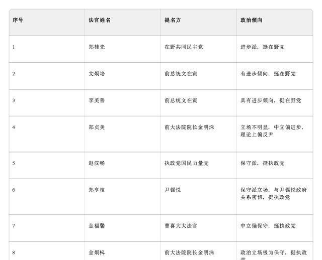 【六、宪法法院,8名法官客观存在的事实,8名法官有半数以上的法官偏保守(执政党),这对宣判有微妙的影响力】