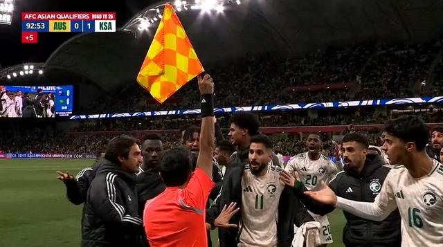 比分牌上,沙特阿拉伯1:0领先,客队陷入疯狂庆祝中。不过裁判坚定地举旗,示意越位,纳哈姆打门的时候,禁区内沙特有球员处于越位位置,虽然没有碰到球,但确实干扰了门将。