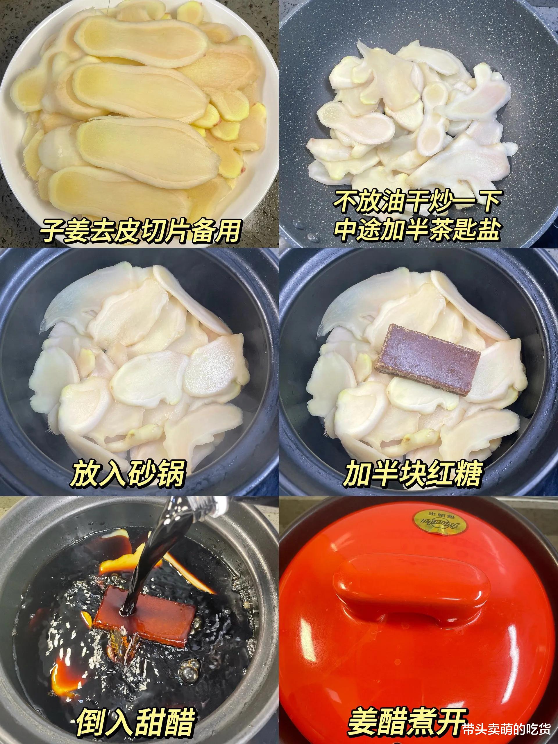 1、把子姜片切好,锅里温度7成热左右不放油直接放入子姜片,加入半茶匙的盐一起翻炒出香味,接着把子姜放进砂锅里,加入半块红糖,倒入大约7成满的甜醋,盖上盖子把甜醋煮开。
