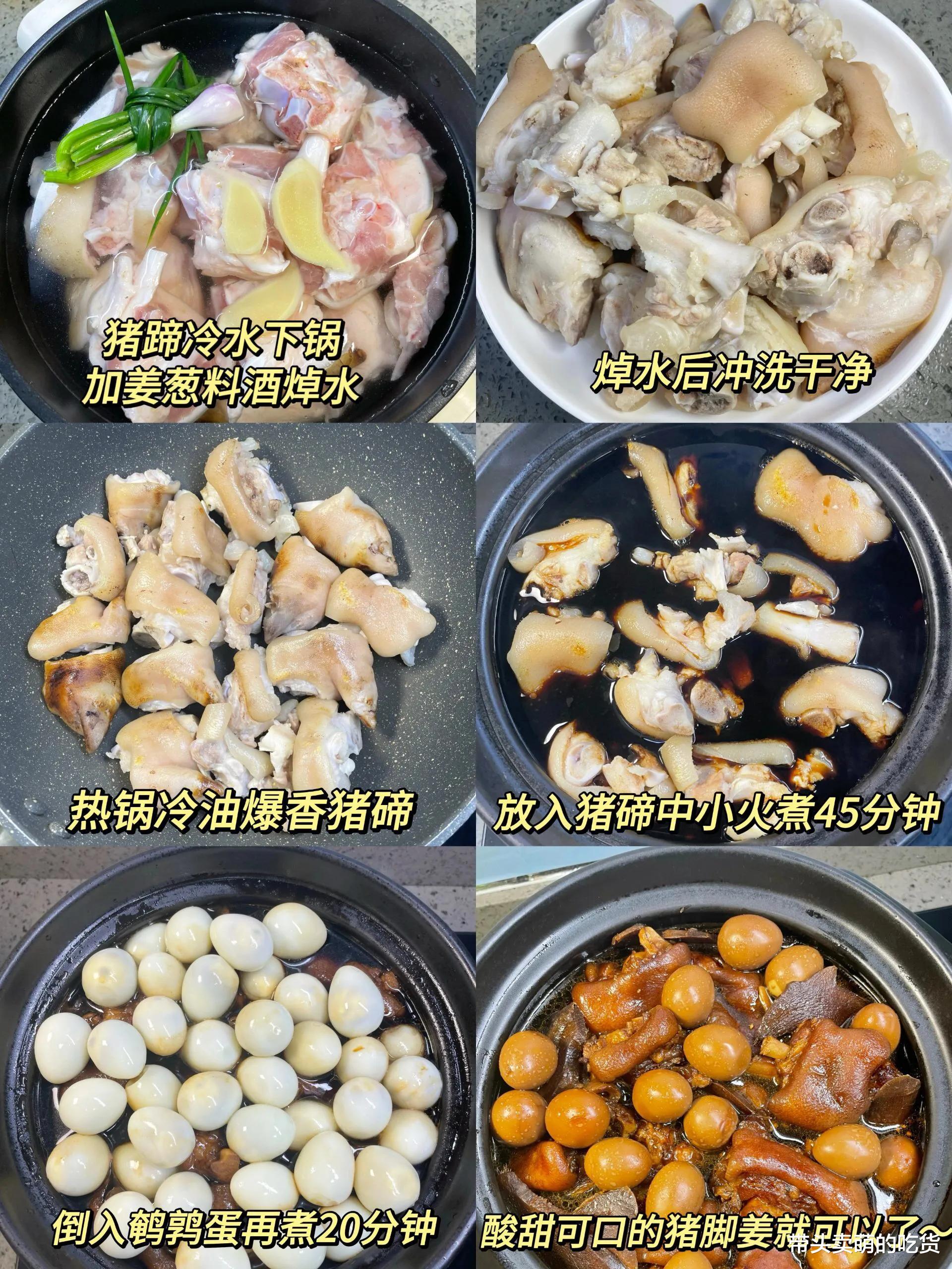 主要食材:猪脚,鹌鹑蛋,葱段,子姜片,红糖,甜醋,料酒,这一锅猪脚姜确实是南方妹子们坐月子的时候吃的美食之一,但并不代表平时不能吃,相反这道菜在南方的小吃店里也很常见,酸甜可口,吃上一口猪更是脚心满意足。