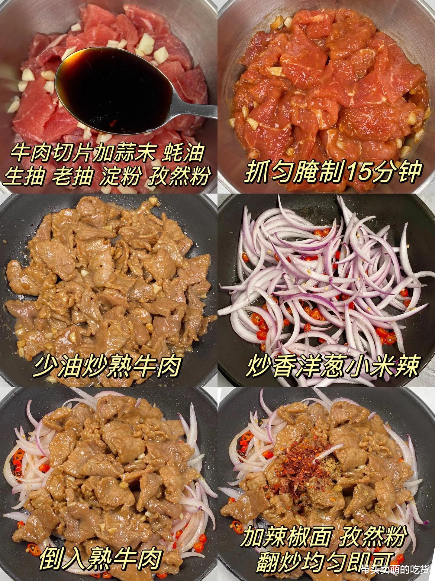 主要食材:牛肉,洋葱,蒜末,淀粉,孜然粉,生抽,老抽,蚝油,小米辣,牛肉腌制到嫩滑入味,洋葱清爽带着孜然的香味,搭配米饭真是绝了。