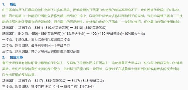体验服13号更新,涉及多位英雄调整,包括:盾山削弱,自身防御力提升,但是控制能力降低;鲁班大师削弱,自身血量提高,大招拉回时间延长;