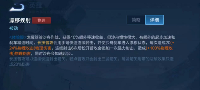 【戈娅】被动技能:【戈娅】驾驶沙洲可以获得额外10%移速加成,在沙舟漂移状态下按住普攻键可以连续射击,每次造成20(+24%物理攻击)物理伤害,连续射击6次后,松开普攻键,可以追加一次强力射击,造成大额物理上线。