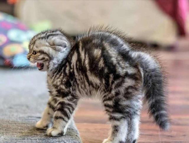 猫突然弓背炸毛,像个移动的毛绒拱桥,多半是被吓到了!这是祖传的“吓人绝招”:把身子撑大,假装自己超凶,想吓跑对手。内心戏:“快走开!本喵超厉害!”(其实可能连蟑螂都怕)