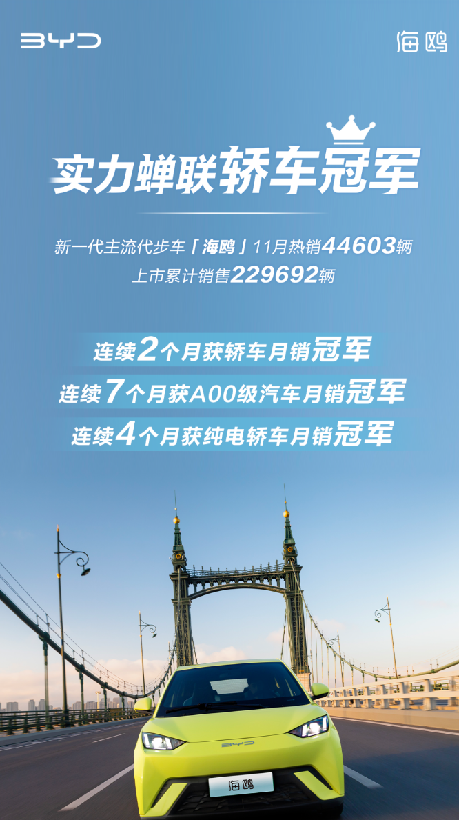 2023年接近尾声,新的一年马上就要到来,在过去的一年里,各大汽车主机厂可谓有人欢喜有人愁,而要说2023年哪个主机厂最欢喜,国产领头羊比亚迪汽车肯定是答案之一,比亚迪2023年销量一路高歌猛进,旗下多款车型成为爆款,其中今年上市的海鸥更是成为市场的一匹黑马,屡屡创造月度销量记录,在2023年11月,比亚迪海鸥再次斩获44603辆销量,今年累计销量已经接近23万台。