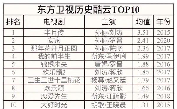 东方卫视酷云收视top10中,前三部都是孙俪主演的作品。