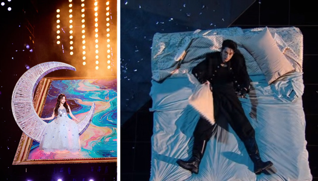 虞书欣坐在“月亮之上”古偶式出场;陈楚生在一道缓缓打开的大门中露出身影,废旧的汽车道具营造电影感;王鹤棣从天而降、一跃而下,随后切歌突然后仰落到一张床上,转场比德芙还丝滑;王源像奔跑在城市里、解锁不同街景道具、一镜到底一气呵成。