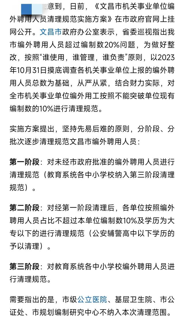 最近,一段时间老是在网络上看到要清退编外人员的消息,前段时间某部门也要求,各级政府单位不得通过劳务派遣的方式雇佣编外人员,但是因为某些缘故,这个要求并没有在全国范围落实,但是清退编外的消息一直在网络上流传,实际清理编外人员的单位还是少数,很多地方的编外人员一直在保持增长,不过最近这个海南文昌却走出不一样的路线,透过媒体得知海南文昌从学历上对编外人员进行削减。