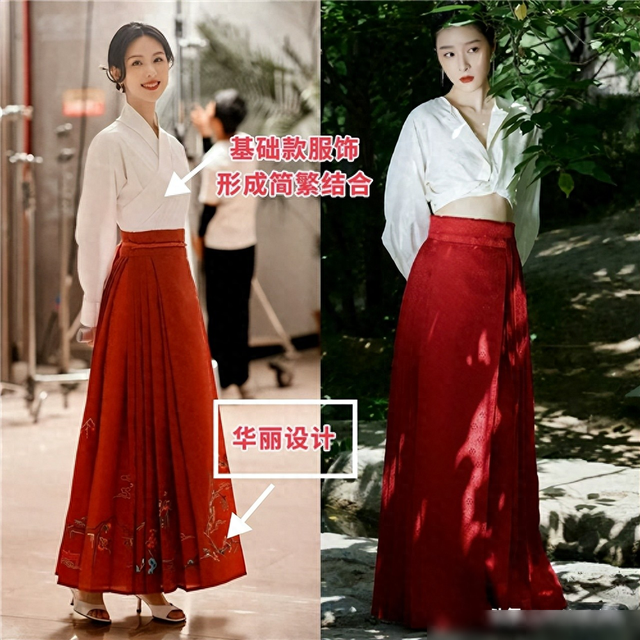 现代风与传统风结合。关于马面裙曾经非常流行,但是现如今却显得有些浮夸,因此有人想要用一种特殊的方法来降低这种浮夸感,让它能适应现代时尚。