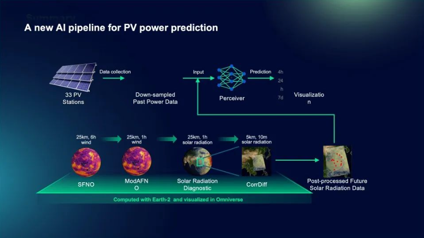 孙玮介绍,光伏发电作为绿色能源转型的核心赛道,其波动性与电网稳定性之间的固有矛盾亟待技术破局。传统数值天气预报虽能提供一定的预测能力,但在天气剧烈变化时往往精度受限。NVIDIA Earth-2作为一款气候数字孪生云平台,结合了AI、GPU加速、物理模拟和计算机图形学的强大功能,能够以前所未有的准确性和速度在全球范围内进行天气和气候预测并生成数据。利用预测数据,光伏发电量预测精度将比单纯依靠时间序列模型提升3至5个百分点。
