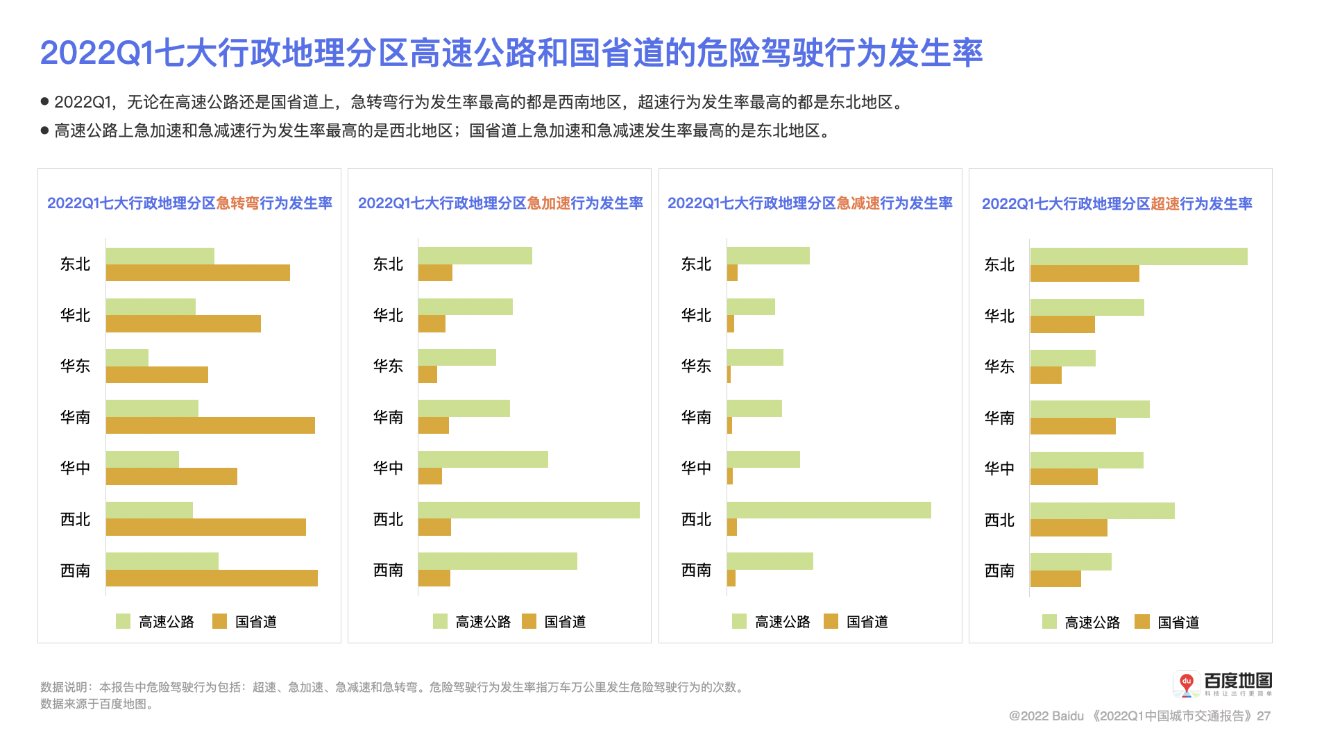 此次《报告》增加了道路交通安全板块,首次披露百度地图道路交通安全大数据。数据显示,2022年第一季度,全国高速公路的危险驾驶行为(即三急⼀超,急加速、急减速、急转弯、超速)发生率高于国省道。第一季度后半程,全国⾼速公路的危险驾驶⾏为发⽣率出现微幅上升,而全国国省道波动变化较为平稳。