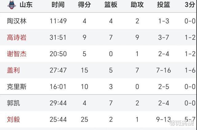比赛数据亮点:山东队四位球员表现出色,刘毅拿下个人职业生涯最高的25分,高诗岩贡献9分、7个篮板和9次助攻,库马杰得到12分和7个篮板,克里斯则有10分和3个篮板进账。广州队方面,外援麦克韦恩独得28分、8个篮板和4次助攻,但全队三分球命中率仅为25%。