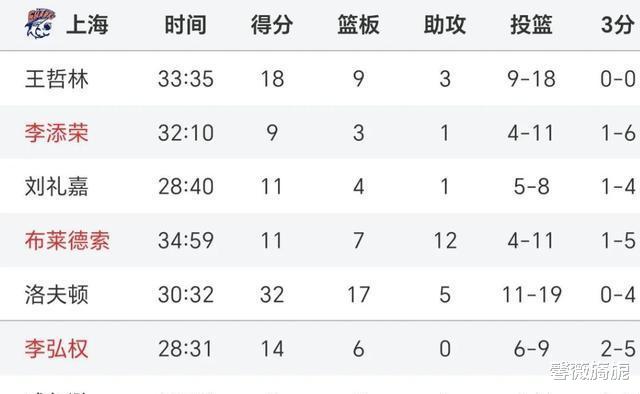 比赛数据亮点:上海队有五名球员得分超过两位数,其中洛夫顿表现抢眼,拿下32分、17个篮板和5次助攻,王哲林贡献18分和9个篮板,布莱德索则有15分和12次助攻。宁波队方面,六人得分上双,罗凯文得到15分,马奇贡献20分、5个篮板和4次抢断。