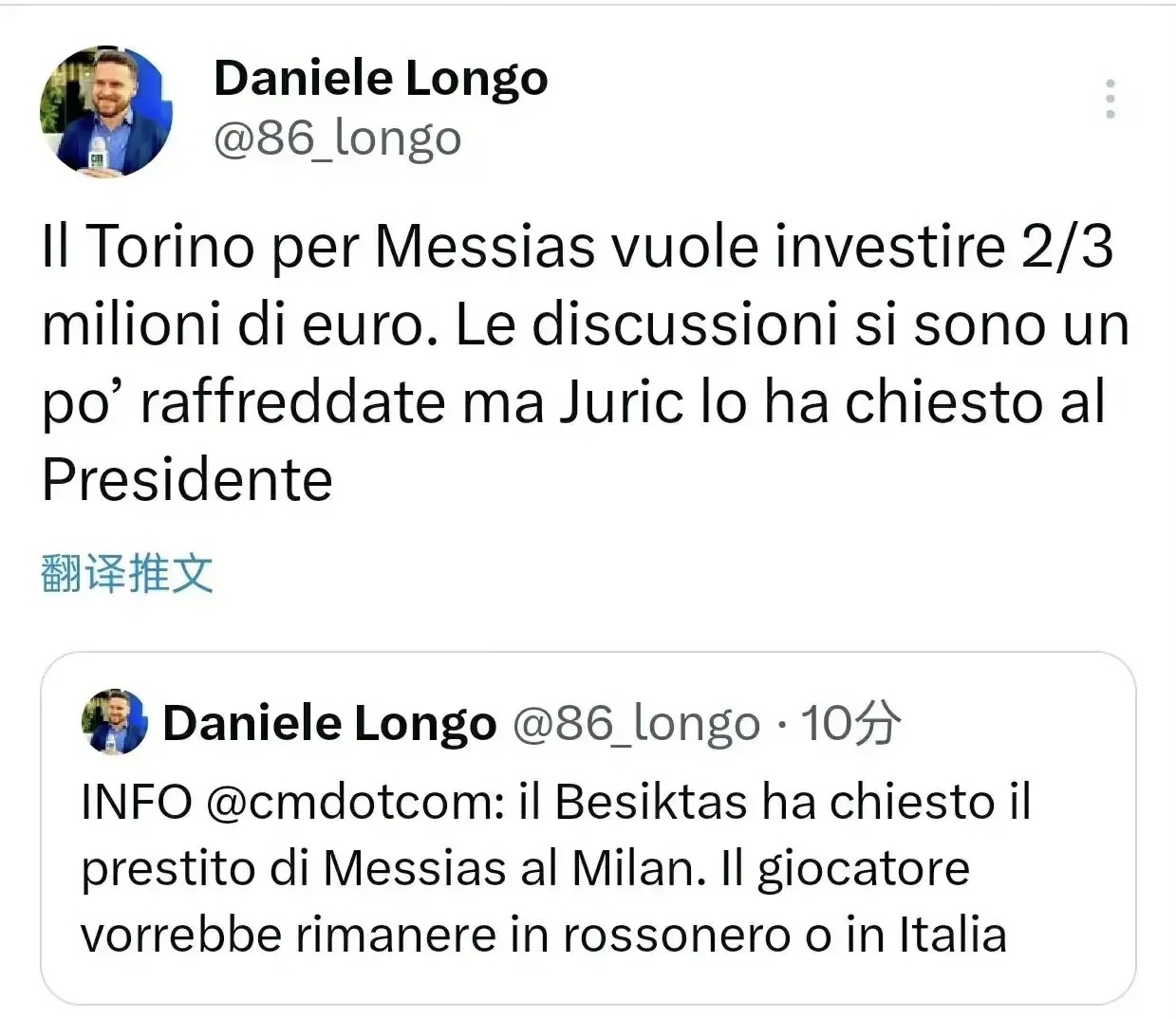 龙哥:贝西克塔斯向米兰提出租借梅西亚斯,但球员更愿意留在米兰或者留在意甲踢球。